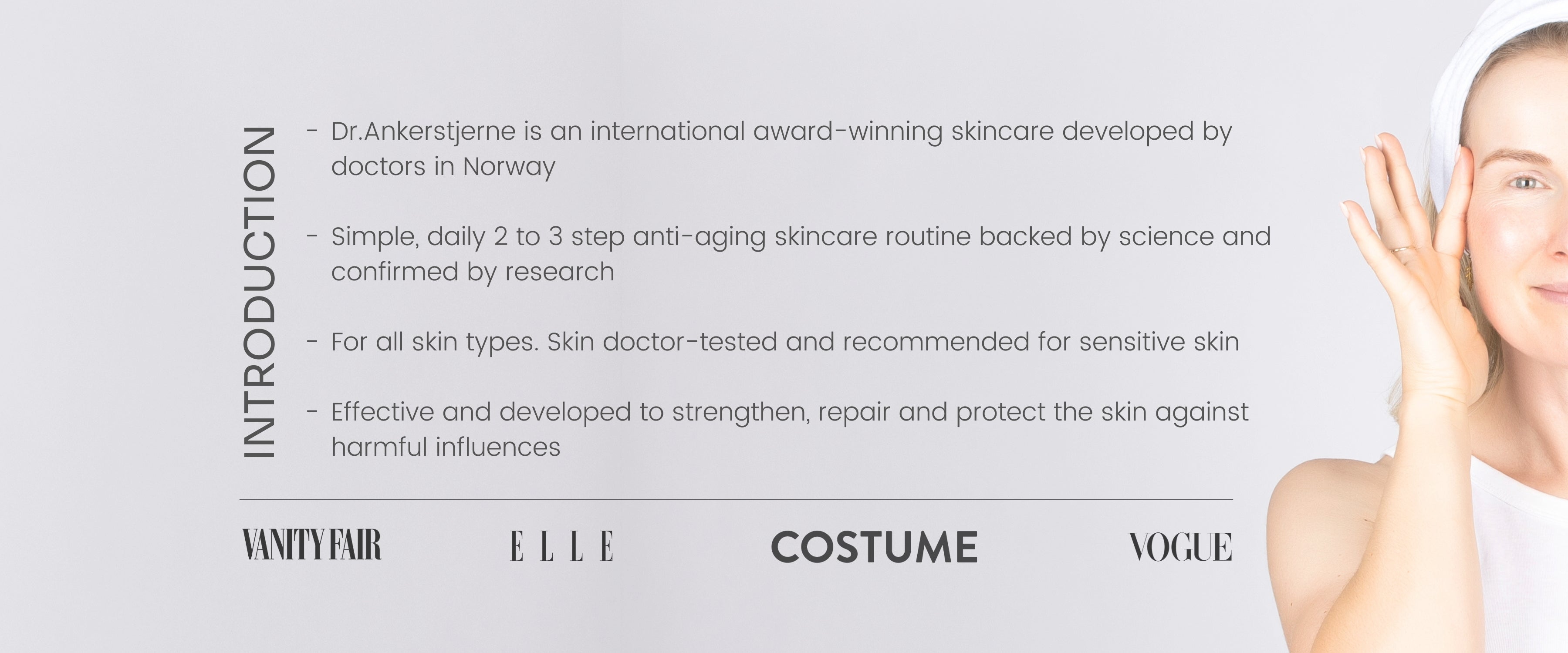 Dr.Ankerstjerne is quality skin care for those who want a simple and effective anti-aging skin care routine that actually works. Our series has only 5 products. All unnecessary elements have been removed, which makes it easy to get an overview of what your skin actually needs.